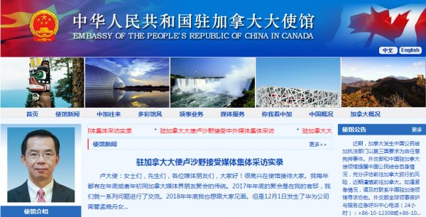 1月17日,中国驻加拿大大使卢沙野对加方发出警告:希望加方三思而后行。